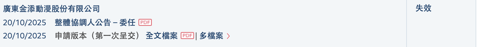 自广东金添动漫股份有限公司客岁10月20日递交港股招股书后,满6个月仍无发扬,记者查询港交所网站看到,其情景一经更新为“失效”。