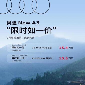 车盟快讯:一线豪华狠起来比谁齐凶!奥迪认真将价拼杀入15万级,其中Q2L限时如一价(60期贷款):35 TFSI 前卫动感型14.5万元;New A3 Sportback 限时如一价(60期款) :35 TFSI PA 尊享型15.4万元;New A3L Limousine 限时如一价(60期款) :35 TFSI PA 尊享型15.5万元。奥迪打响第一枪开云体育,奔突和良马如何应付?10几万预算开云体育,你会冲奥迪吗?