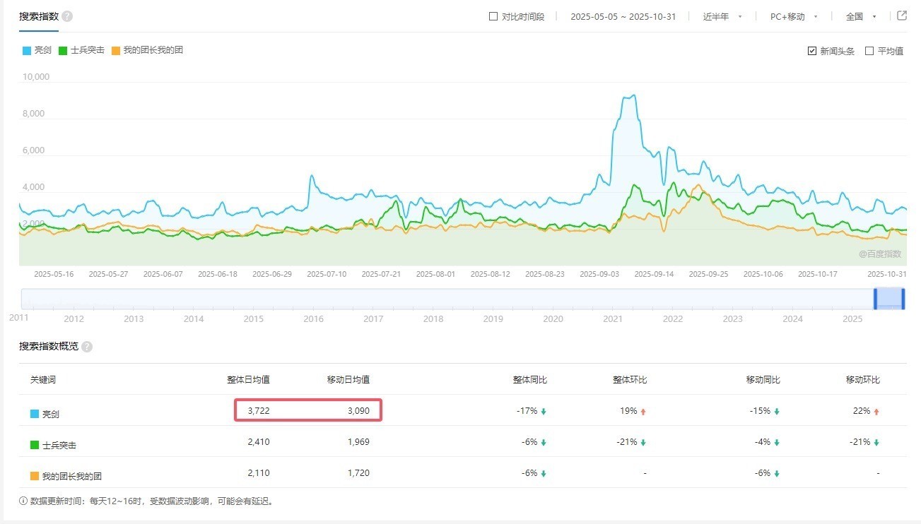更迫切的,如故畴昔二十年了,当我试着用搜索指数去稽察亮剑的数据时,我发现,亮剑的数据真实仍然能保捏日均3000多的搜索量,此自后播出的电视剧《士兵突击》和《我的团长我的团》,东谈主家的搜索指数齐莫得亮剑那么高,致使亮剑还呈现出全体环比和迁徙环比高潮的趋势,这些齐能看出来亮剑的实力。