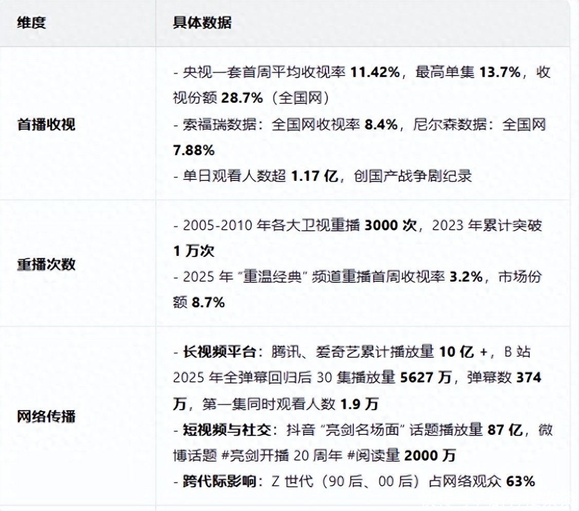 首播的收视率达到了11.42%,单集的收视率致使有冲到13.7%的超高收货,致使单日不雅看东谈主数就多达1.17亿,重播次数在五年内部,就多达3000次,要知谈,这然而2005年那会的互联网并不是很进展的年代,到了互联网期间,长视频平台播放量达到10亿+,段看穿的亮剑播放量达到了87亿,十分于十四亿中国东谈主每东谈主最少看了6次以上的亮剑。