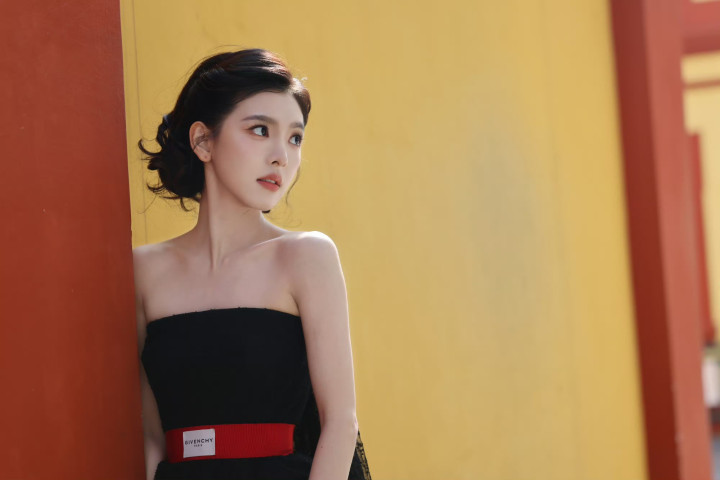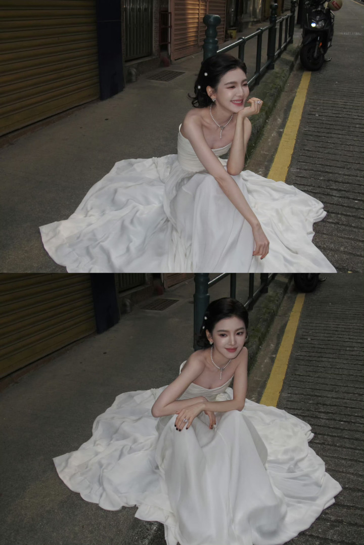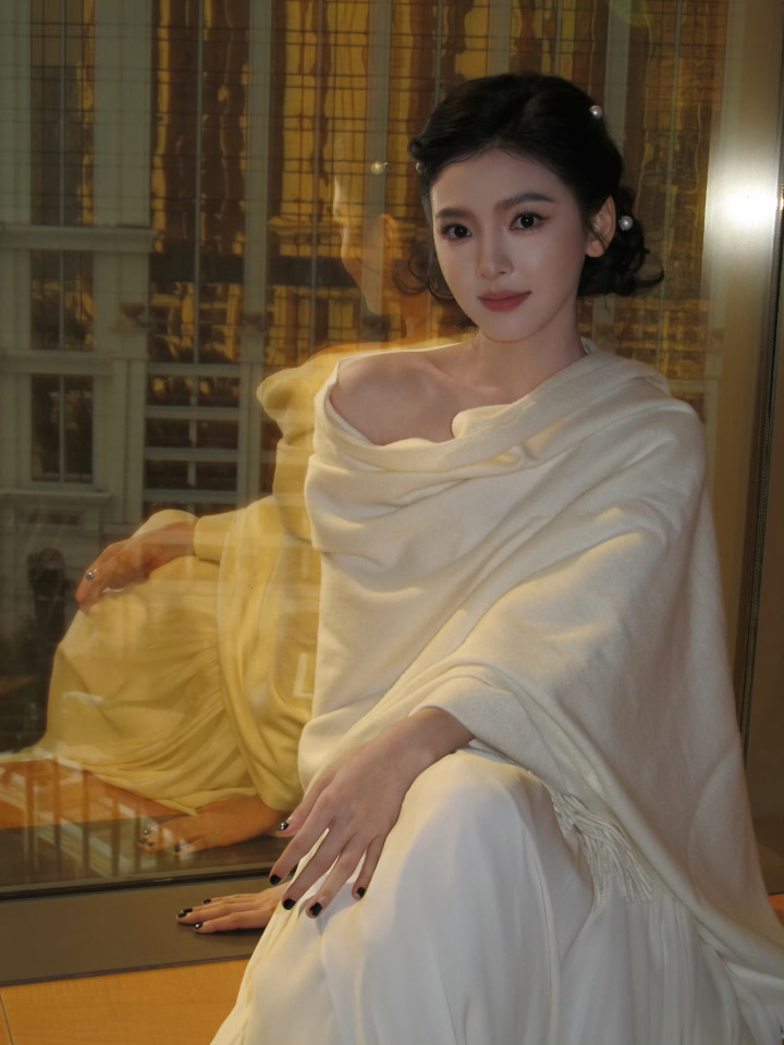 章若楠衣裳抹胸褶皱白裙,抹胸牢牢收住肩颈的软线条,腰腹被裙身当然裹出纤细弧度,连褶皱垂落的走向皆顺着体态,松而不垮。