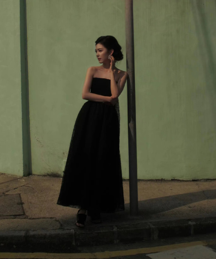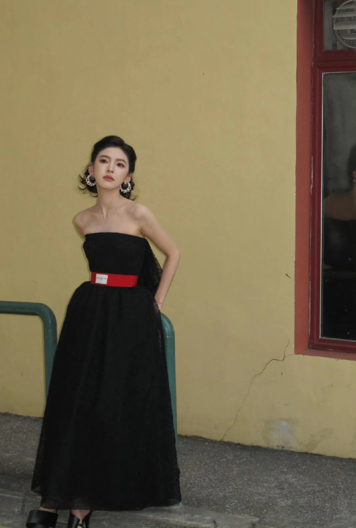 另一套黑纱抹胸裙冷艳扫数,露馅的锁骨和肩头浸在暖光里,却透着层冷调的雾感;腰间那抹亮红腰带像颗跳色的糖,勾出腰腹的凛凛弧度。