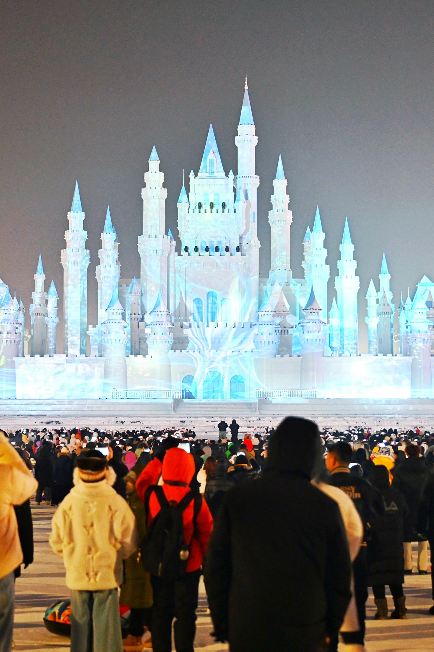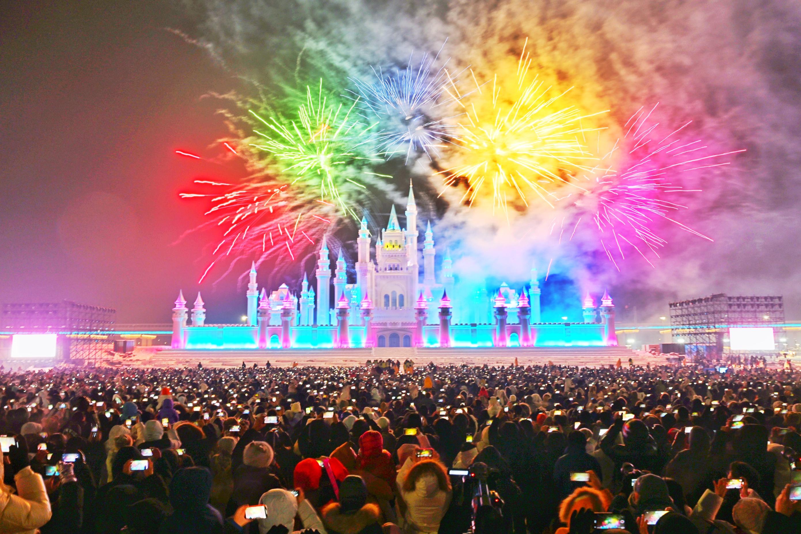 冰雪城堡与烟花秀点亮城市夜空