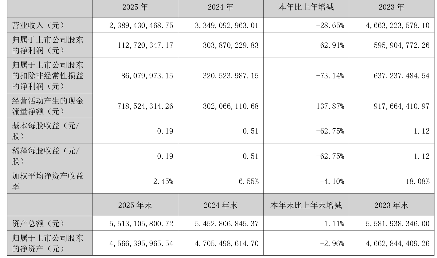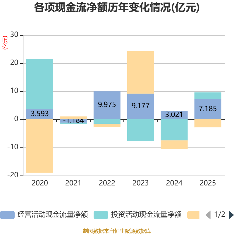 收尾2025年,公司野心行径现款流净额为7.19亿元,同比增长137.87%;筹资行径现款流净额-2.84亿元,同比增多2814.34万元;投资行径现款流净额2.4亿元,上年同时为-7.51亿元。