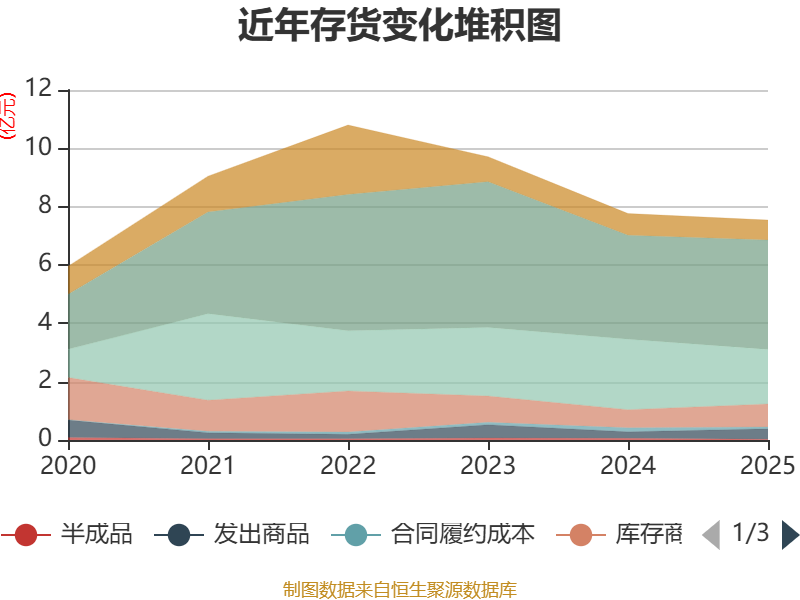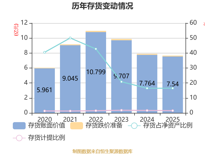 从存货变动来看,收尾2025年末,公司存货账面价值为7.54亿元,占净金钱的16.51%,较上年末减少2241.73万元。其中,存货跌价准备为1179.47万元,计提比例为1.54%。