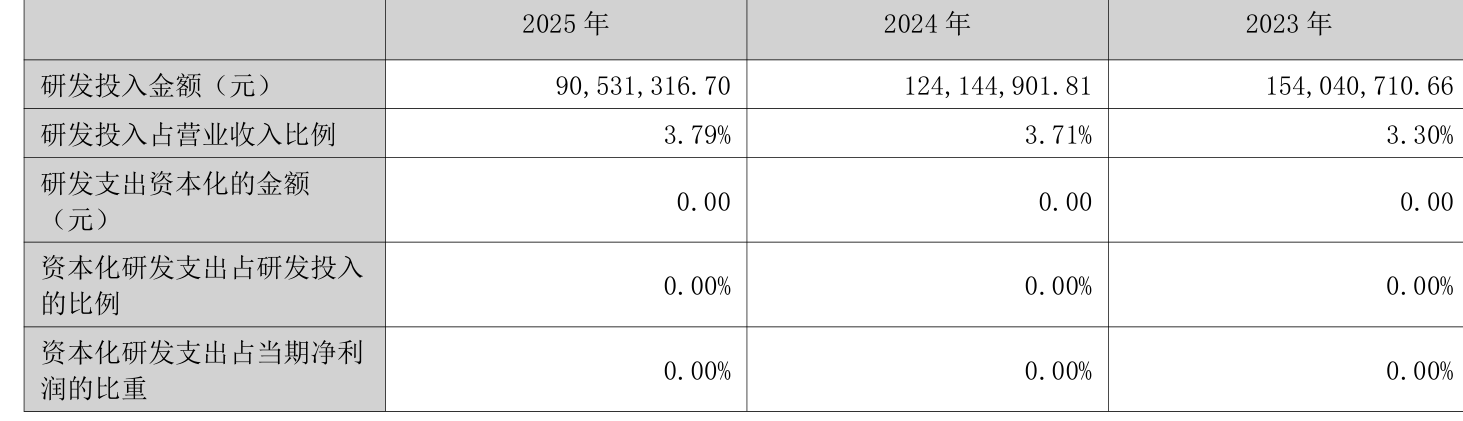 2025年全年,公司研发干涉金额为9053.13万元,同比下落27.08%;研发干涉占交易收入比例为3.79%,比较上年同时飞腾0.08个百分点。此外,公司全年研发干涉成本化率为0%。